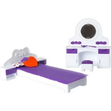 Очень стильный и яркий набор кукольной мебели Спальня станет прекрасным украшением кукольного домика. Миниатюрная кровать выглядит как настоящая. Особую достоверность добавляют выдвижные ящики у двух прикроватных тумб и в трюмо.