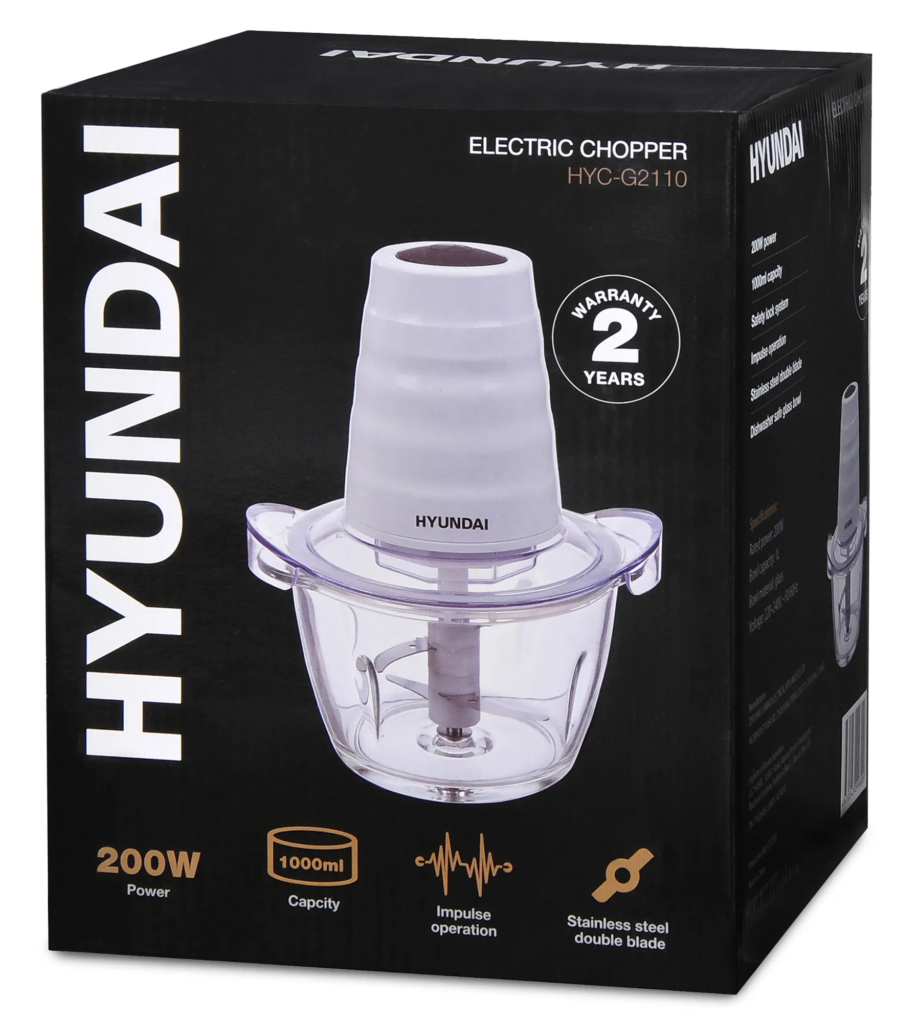 Измельчитель Hyundai HYC-G2110 - прибор, незаменимый на каждой кухне. Он позволяет быстро довести до однородной консистенции зелень, овощи, фрукты, сыр и даже отварное мясо. КАК ПОЛЬЗОВАТЬСЯ? Поместите продукты в чашу, закрепите редуктор и активируйте устройство, нажав на кнопку сверху корпуса. Один цикл работы не должен превышать более минуты. ДЛЯ ВАШЕЙ БЕЗОПАСНОСТИ Модель оснащена надежной защитной системой, которая предотвратит включение при не надетой крышке. А нескользящее основание из силикона не даст кухонному помощнику опрокинуться и упасть со стола. ПРОСТОЙ УХОД По завершению измельчения уберите полученную массу из емкости, используя предусмотренную в комплекте пластиковую лопатку. Блок электродвигателя достаточно протереть слегка влажной тканевой салфеткой. Остальные части корпуса можно мыть в воде с мягким гелем для посуды.