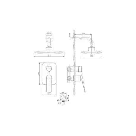 Керамический картридж Sedal 35 мм. Двухпозиционный картриджный переключатель. Верхняя поворотная душевая лейка Тропический дождь 170x246 мм. 1-функциональная лейка 50х143 мм. Настенное поворотное крепление для лейки. Душевой шланг 2 м. Подключение для душевого шланга. Металлическая рукоятка