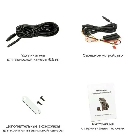 видеорегистратор, выносная камера (опционально), удлинитель для выносной камеры 6, 5 метров (опционально), зарядное устройство, GPS-модуль, кронштейн на 3м-скотче, дополнительные аксессуары для крепления выносной камеры, инструкция с гарантийным талоном, упаковка