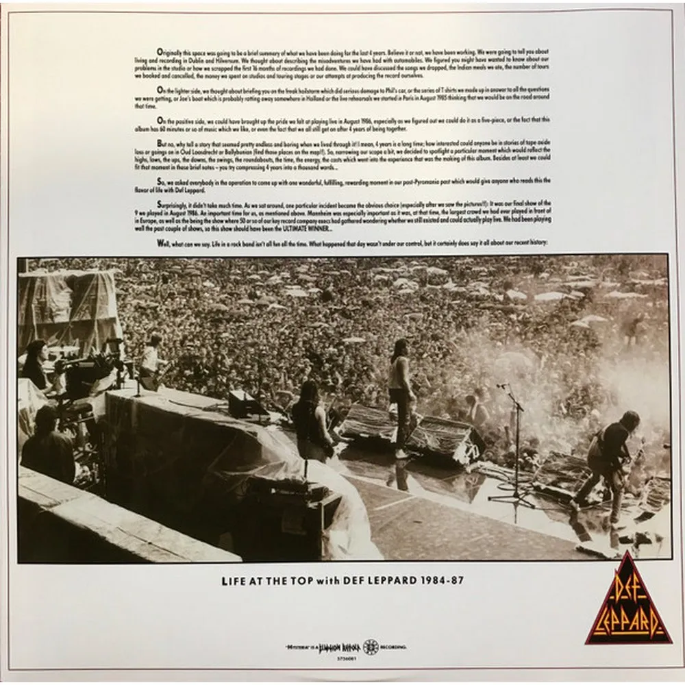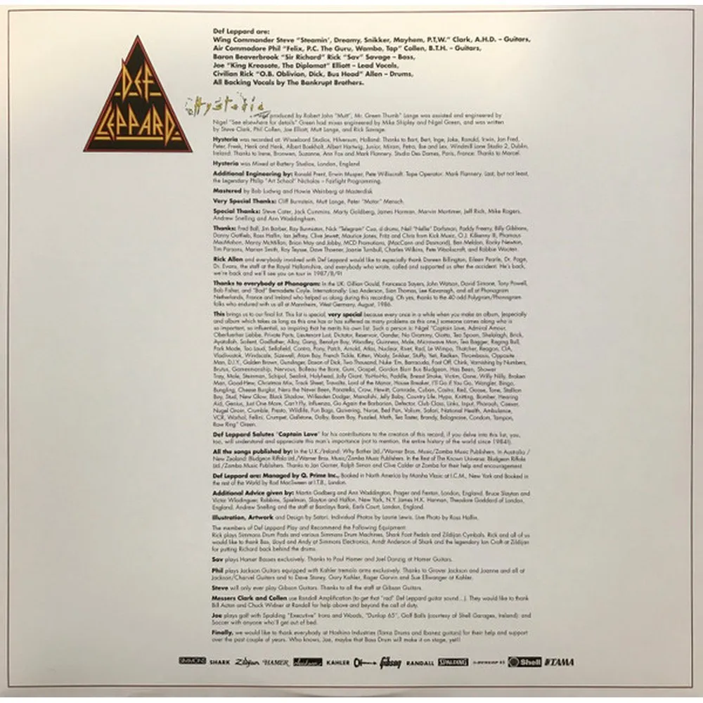 Юбилейное ремастированное переиздание четвертого студийного альбома Def Leppard Hysteria, вышедшего в 1987 году. На сегодняшний день это наиболее успешный альбом группы, проданный тиражом 30 миллионов копий. Версия на двойном виниле. Британская рок-группа Def Leppard образовалась в 1977 году и успешно выступает до сих пор. Пик популярности коллектива пришелся на вторую половину 80-х годов, когда были выпущены платиновые альбомы Hysteria и Pyromania. Среди самых успешных синглов стоит отметить Love Bites (первое место в американском чарте), Pour Some Sugar On Me (второе место) и Armageddon It (третье место). В 1995 году группа попала в Книгу рекордов Гиннесса за то, что в течение одних суток выступила на трех континентах.