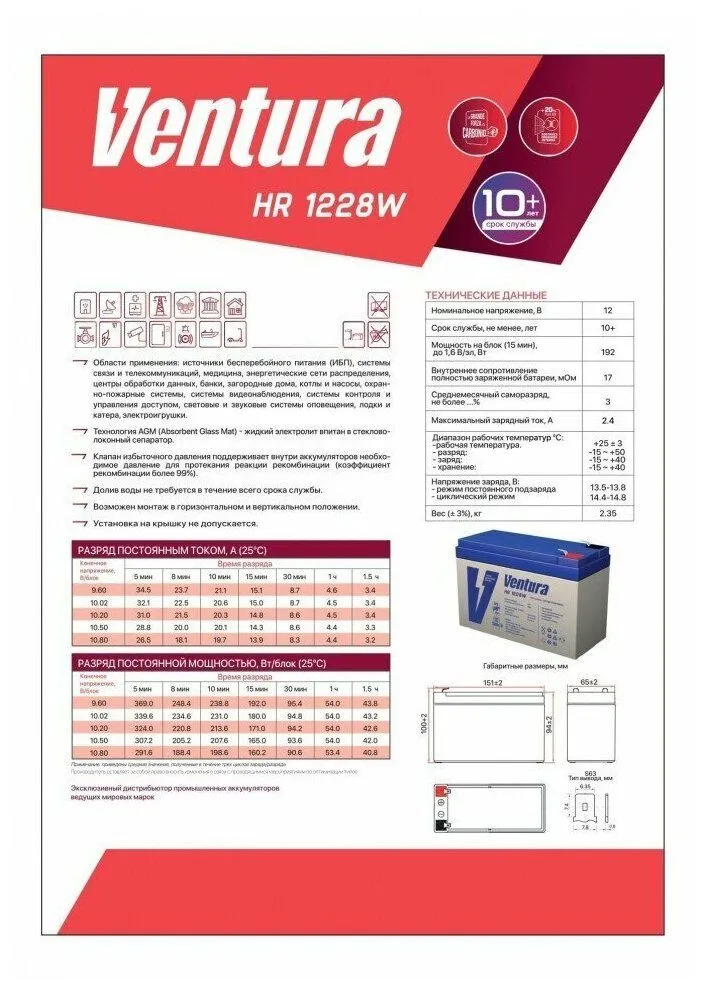 Ventura HR способны отдавать при коротких режимах разряда до 40 % больше мощности, чем стандартные аккумуляторы. Серия HR – линейка необслуживаемых стационарных аккумуляторов широкой сферы применения с высокими токовыми характеристиками, номинальным напряжением 12 В, и увеличенным сроком службы (10+ лет), изготовленные по технологии AGM. Аккумуляторы данной серии предназначены преимущественно для коротких режимов разряда. Разработкой и внедрением занимались в Северной Италии (производство и контроль качества сейчас находится во Вьетнаме) - это значит качество, инновации и технологии за 15 лет на рынке! Широкий спектр применения – от установки в бытовые и офисные источники бесперебойного питания до использования в промышленности и энергетике! Эксплуатация аккумуляторов возможна, как в буферном (постоянная подзарядка), так и в циклическом режиме работы.