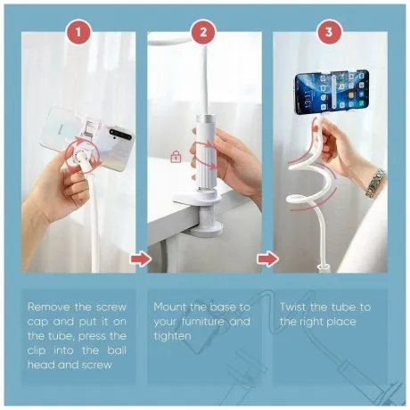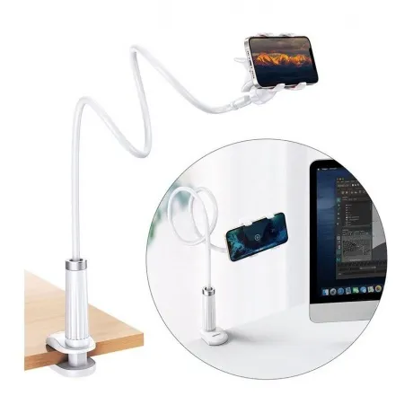 Освободи руки, чтобы смотреть фильмы, снимать видео, читать рецепты, играть в игры и т. д. Гибкий держатель легко вращается и не требует усилий. Держатель подходит для крепления на поверхность шириной до 8 см, хорошо подходит для различных столов, полок, столов на кухне, в спальне, гостиной, офисе и т. д. Этот удобный держатель для телефона позволяет вращать его на 360° для идеального просмотра и оптимального положения вашего устройства. Длина гибкого держателя (80 см) идеально подходит для удовлетворения различных потребностей.