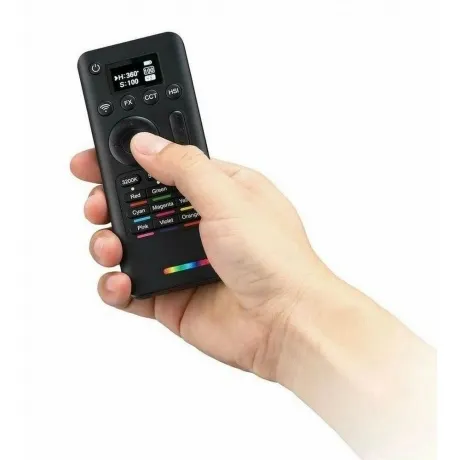 Пульт дистанционного управления Godox RC-R9II служит для беспроводной настройки параметров RGB-осветителей Godox. С помощью пульта ДУ можно управлять яркостью светового потока, цветовой температурой, запускать различные режимы световых спецэффектов, задавать цвет в режиме rgb и многое другое. Пульт ДУ работает на частоте 2.4 ГГц и способен управлять параметрами осветителя на расстоянии до 100 метров. Пульт поддерживает 32 канала, 16 групп и объединяется в 99 ID для организации сложных световых схем, а также для устранения помех от других аналогичных систем радиоуправления. Питается от 2-х батареек типа AAA (приобретаются отдельно).