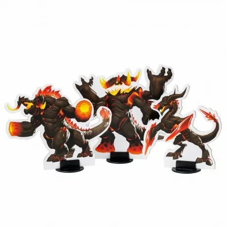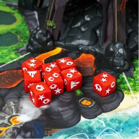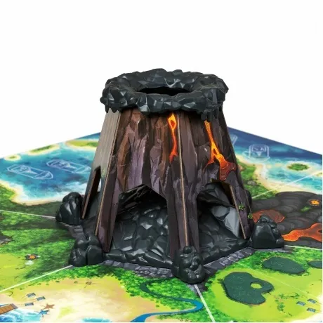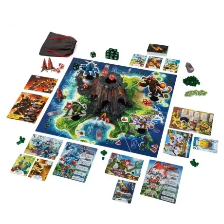 игровое поле Острова Монстров 5 планшетов монстров планшет босса модель вулкана 10 кубиков монстров 8 кубиков босса 51 карта способностей 15 карт событий 8 картонных фигурок 6 листов союзников 3 листа боссов 30 жетонов прислужников 8 пламышей 12 жетонов кристаллов 3 жетона монолитов 12 жетонов поддержки мешочек кубы и жетон энергии правила