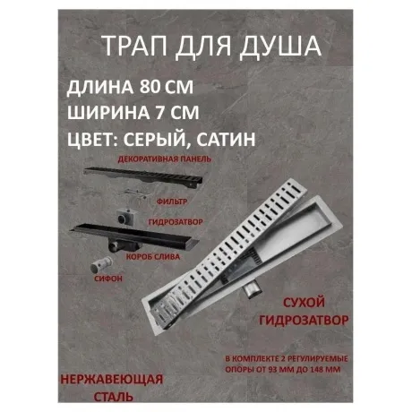 встраиваемый сифон, выпуск, гидрозатвор, грязеуловитель, декоративная накладка, крюк для демонтажа, лоток, набор для установки, ножки, решетка, сифон, сухой затвор, трап, труба сливная
