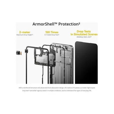 Realme C75 переживает без негативных последствий падения с высоты до 2 метров на твердую поверхность и устойчив к повседневному износу от мелочи, ключей в карманах или трению о твердые поверхности. Благодаря защите ArmorShellTM корпус и внутренние элементы смартфона полностью защищены от ударов и механических воздействий. Кроме того, смартфон был сертифицирован по стандарту MIL-STD 810H, гарантирующему его надежность.