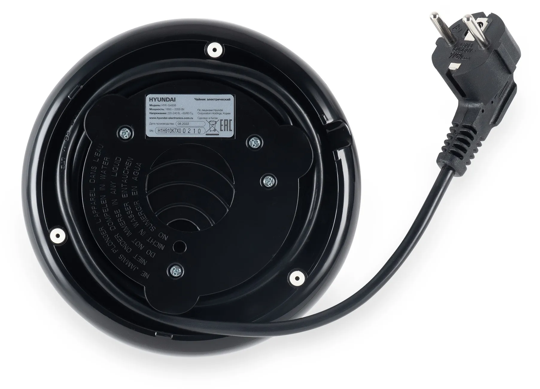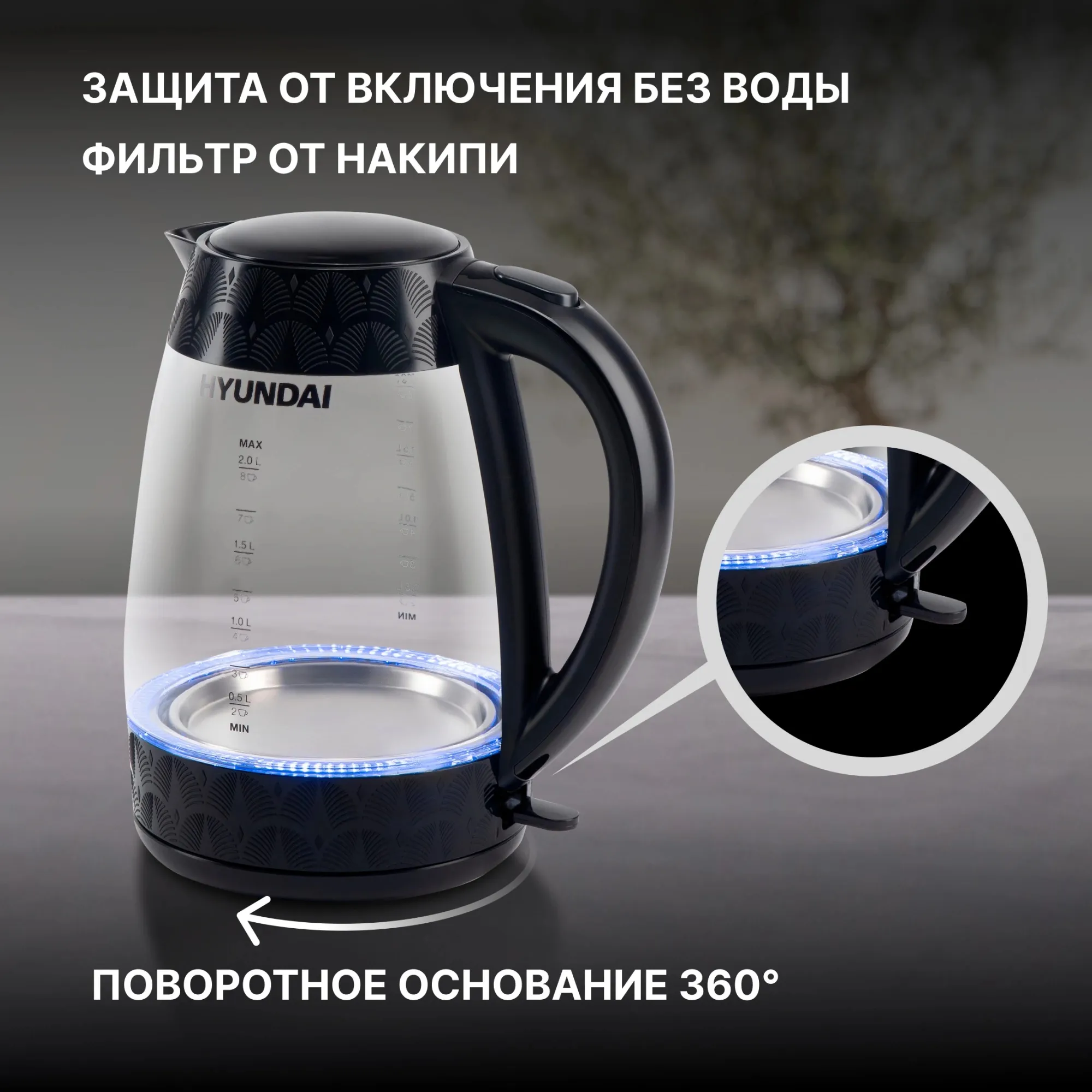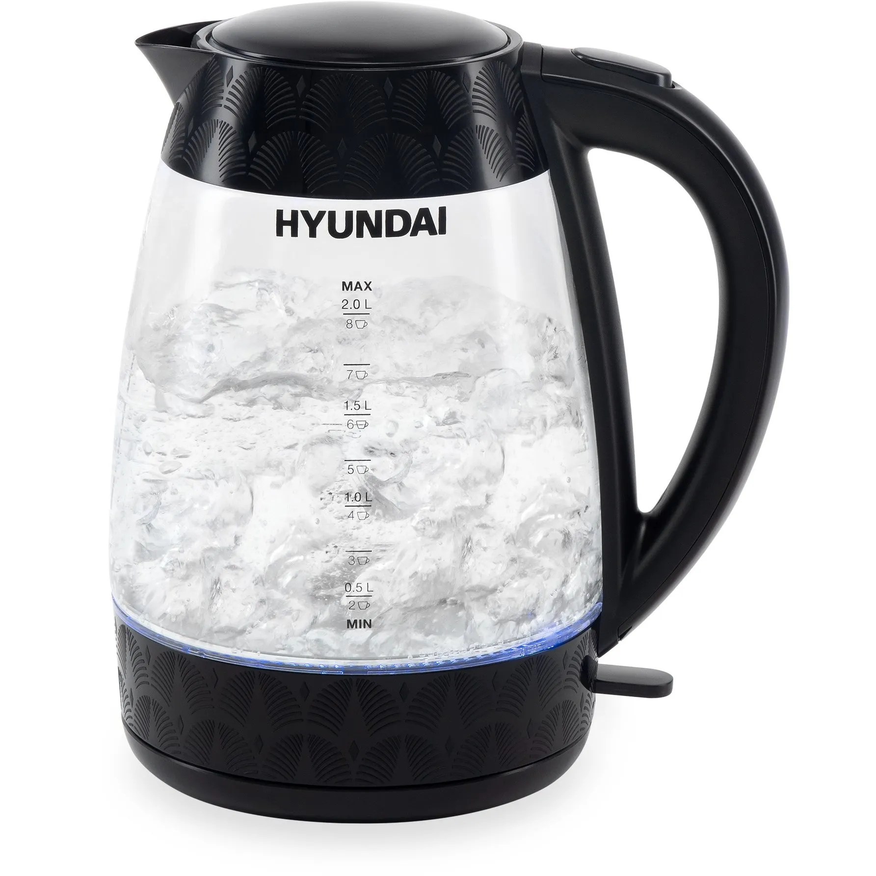 С чайником Hyundai HYK-G4505 вода нагреется до температуры кипятка за считанные минуты. Стенки прибора выполнены из стекла, которое отлично поддерживает кипяток горячим в течение долгого времени. Пластик, из которого выполнена подставка и многие детали устройства, не влияет на вкус воды, а также прочен и надёжен. В дно чайника встроена яркая подсветка, которая выполняет декоративные функции и выступает в качестве индикатора работы прибора. Интегрированные лампы освещают жидкость на 360 градусов. На бок Hyundai HYK-G4505 также нанесены отметки, по которым можно судить о заполненности ёмкости прибора. Максимальный объём жидкости, который помещается в данную модель, составляет 2 л. Предусмотренная мощность 2200 Вт позволяет быстро нагреть их до состояния кипятка. В конце каждого цикла нагрева Hyundai HYK-G4505 отключается автоматически. Крышка устройства открывается по щелчку и надежно закрывается на защёлку. Hyundai HYK-G4505 оснащён защитой от включения без воды, что значительно продлевает ресурс нагревательного элемента. Он эргономично скрыт в поставке для повышения безопасности использования чайника. Минималистичный дизайн устройства позволит ему вписаться в любой интерьер.