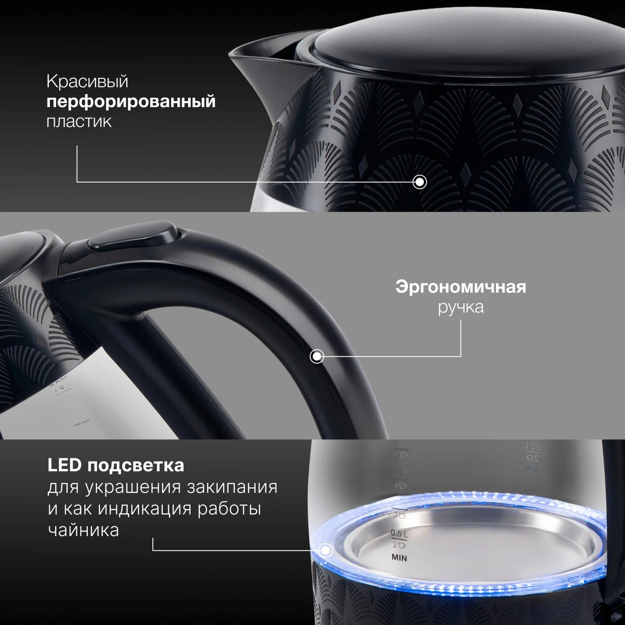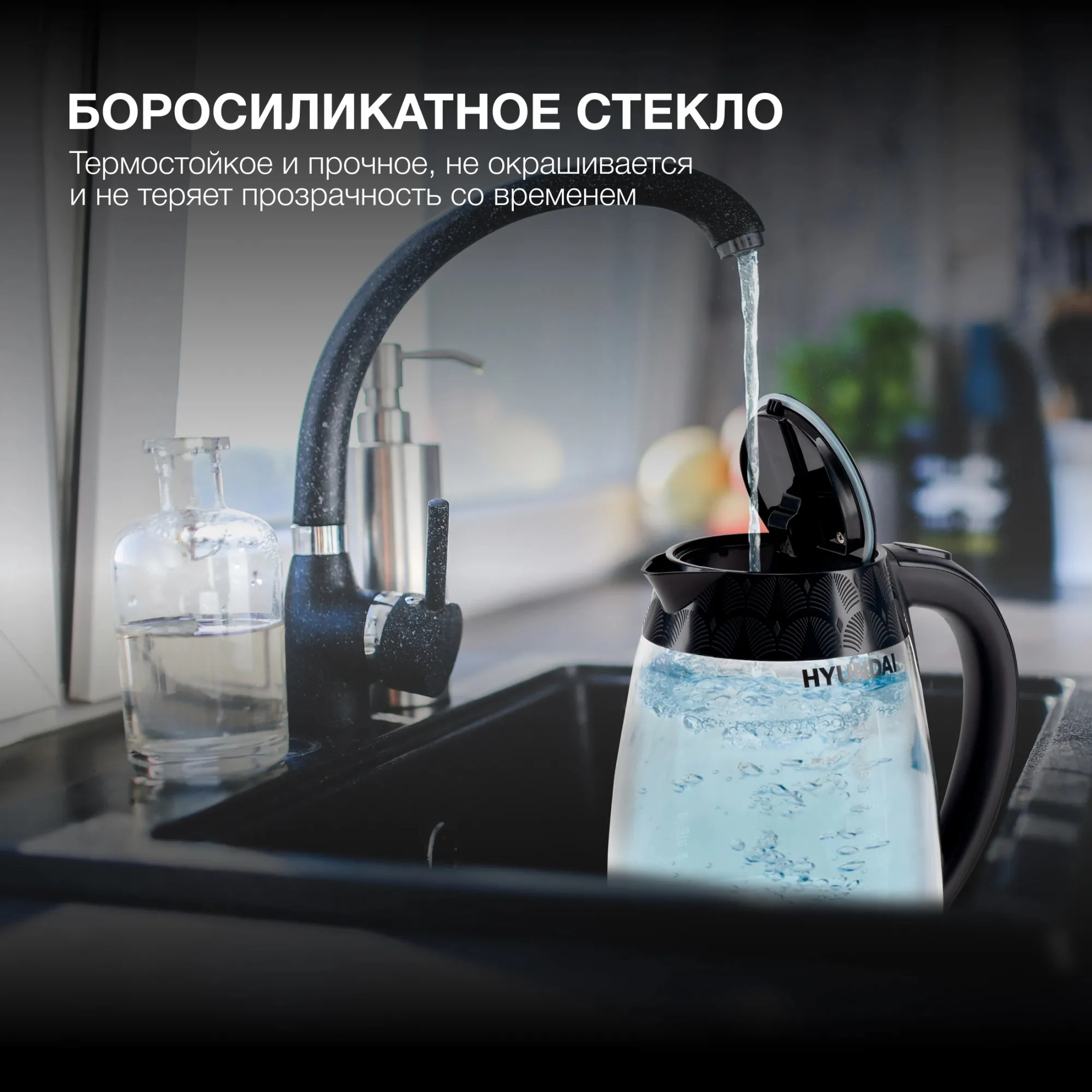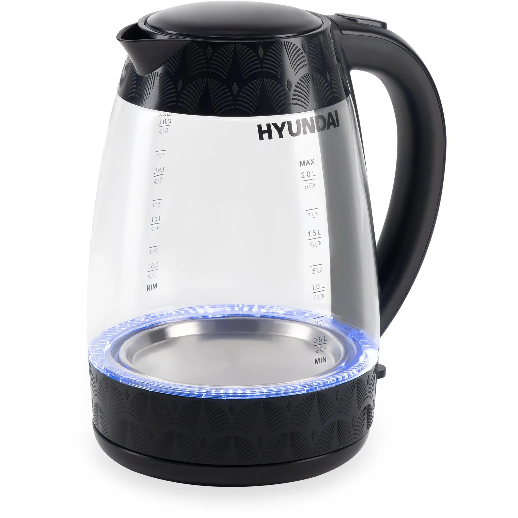 С чайником Hyundai HYK-G4505 вода нагреется до температуры кипятка за считанные минуты. Стенки прибора выполнены из стекла, которое отлично поддерживает кипяток горячим в течение долгого времени. Пластик, из которого выполнена подставка и многие детали устройства, не влияет на вкус воды, а также прочен и надёжен. В дно чайника встроена яркая подсветка, которая выполняет декоративные функции и выступает в качестве индикатора работы прибора. Интегрированные лампы освещают жидкость на 360 градусов. На бок Hyundai HYK-G4505 также нанесены отметки, по которым можно судить о заполненности ёмкости прибора. Максимальный объём жидкости, который помещается в данную модель, составляет 2 л. Предусмотренная мощность 2200 Вт позволяет быстро нагреть их до состояния кипятка. В конце каждого цикла нагрева Hyundai HYK-G4505 отключается автоматически. Крышка устройства открывается по щелчку и надежно закрывается на защёлку. Hyundai HYK-G4505 оснащён защитой от включения без воды, что значительно продлевает ресурс нагревательного элемента. Он эргономично скрыт в поставке для повышения безопасности использования чайника. Минималистичный дизайн устройства позволит ему вписаться в любой интерьер.
