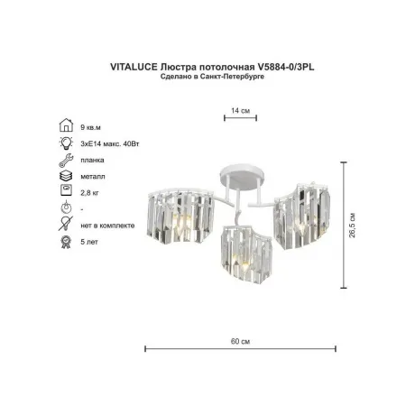 потолочная люстра с тремя плафонами из хрусталя, предназначена для помещений площадью до 6 кв.м. оснащена тремя цоколями e14 с максимальной мощностью ламп 40вт каждая. минимальная высота подвеса 26,5 см, диаметр 60 см. подходит для гостиных, возможна работа с диммером. гарантия 60 месяцев.