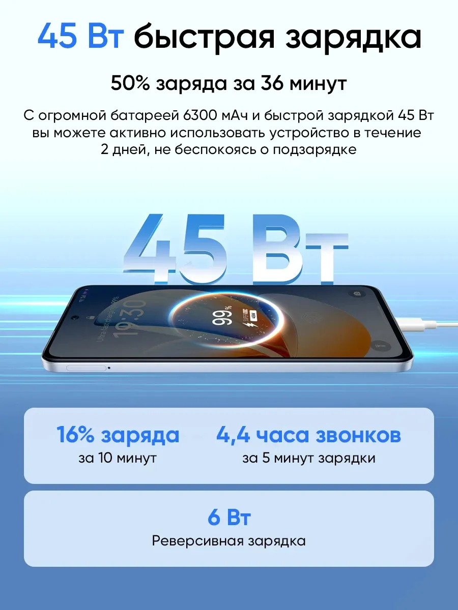 Смартфон оснащен емкой батареей 6300 мАч, что позволяет смартфону работать без подзарядки 2 дня. В случае игр смартфона хватит на 9 часов в многопользовательских играх. При этом смартфон оснащен быстрой зарядкой 45 Вт, способной зарядить половину батареи за 36 минут или за 5 минут продлить жизнь смартфона на еще 4 часа разговоров. Помимо этого, смартфон можно использовать для зарядки ваших аксессуаров благодаря реверсивной зарядке 6 Вт.