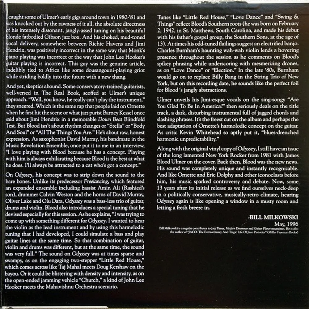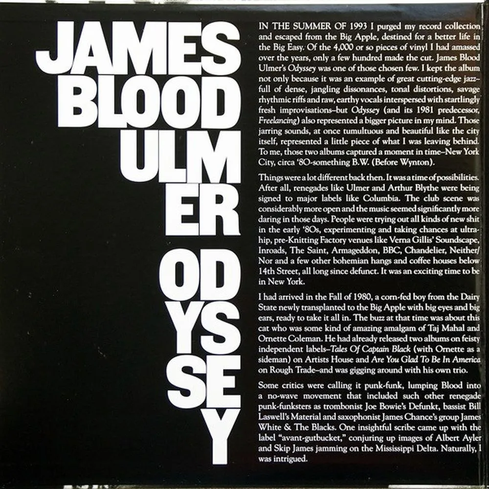 «Не только лучший альбом Ульмера, но и признанная классика современного джазового авангарда». — AllMusic.com. «Odyssey» — знаковый шедевр Джеймса Блада Ульмера, чистейший и доступный образец его смелого, противоречивого гитарного видения. С минимальным аккомпанементом трио — только барабанщик Уоррен Бенбоу и скрипач Чарльз Бернхэм — гитара Ульмера всегда остаётся сердцем ансамбля, особенно учитывая, что его уникальная настройка (разработанная специально для этого альбома) позволяет ему исполнять как басовые, так и соло-гитарные партии. Теперь Odyssey наконец-то получает заслуженное аудиофильское звучание в форме двойного винила, записанного на скорости 45 об/мин с оригинальных аналоговых лент Берни Грундманом, напечатанного на 180-граммовом виниле и упакованного в футляр от Stoughton Printing.