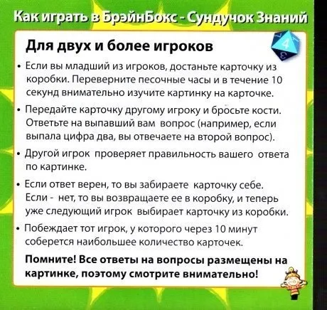 В игре может принимать участие всего 1 игрок. Продолжительность сеанса игры - 10 минут. Цель игры - запоминание информации и верные ответы на вопросы за определенный отрезок времени. Игра развивает внимание, память, эрудицию, расширяет кругозор