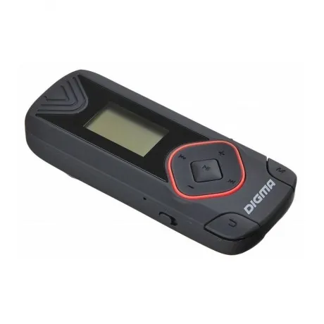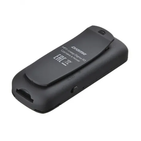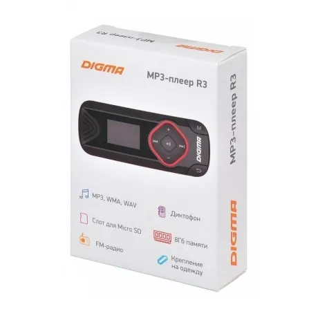 Портативный MP3 плеер Digma R3 очень маленький и легкий, крепится на одежду при помощи клипсы. Помимо проигрывания мелодий, записанных в формате MP3, WMA, WAV, его можно использовать для прослушивания радио и как диктофон., Digma R3 наделен 8 ГБ памяти, еще 32 ГБ можно получить после установки microSD-карты. На небольшом LCD-дисплее отображается меню и выбранный режим работы. Навигация осуществляется с помощью кнопок на корпусе. Питается плеер от встроенного Li-Pol аккумулятора, который обеспечивает до 20 часов непрерывной работы.