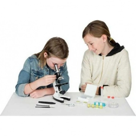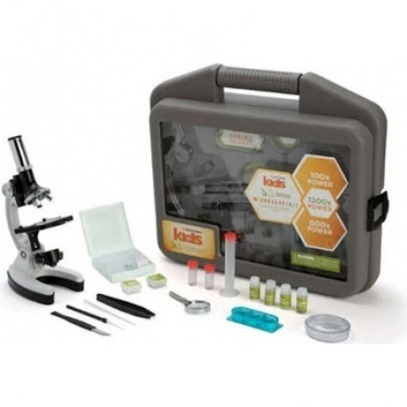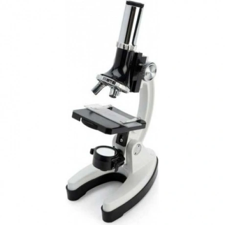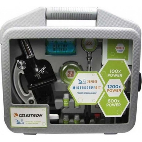 Celestron 100–1200x – монокулярный биологический микроскоп для учебы. Мощный прибор позволяет изучать строение микромира на увеличении от 100 до 1200 крат. Микроскоп станет отличным подарком для учащегося школы и откроет юному биологу неизведанные горизонты микроскопического мира. Прибор оснащен револьверным механизмом с объективами кратностью 10x, 60x и 120x. Увеличение окуляра составляет 10 крат. Образцы фиксируются на металлическом предметном столике. Корпус микроскопа тоже изготовлен из металла, он устойчив и прочен. Наблюдения проводятся в проходящем свете, встроенная нижняя подсветка из светодиодов работает от двух батареек типа АА (приобретаются отдельно). Вместе с микроскопом поставляется набор для лабораторных исследований: посуда, готовые препараты, чашка Петри, лупа кратностью 2x, инкубатор для выращивания рачков, безопасный для детей скальпель и прочие необходимые инструменты. Благодаря удобному комплектному кейсу ребенок в любой момент сможет взять набор с собой на занятие в школе или научном кружке.