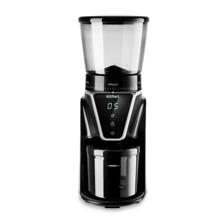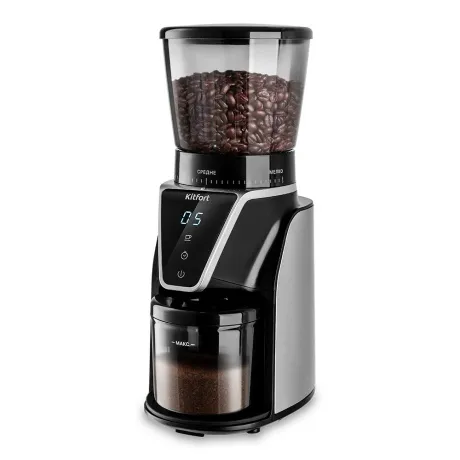 Жерновая кофемолка КТ-784 предназначена для помола кофейных зёрен. Она имеет конические жернова из углеродистой стали. Кофемолка даёт равномерный помол и позволяет настроить его степень: от мелкого - для эспрессо кофеварки, до крупного - для френч-пресса. Кофемолка отличается высокой производительностью в 165 Вт, и за 1 цикл работы способна измельчить до 100 г продукта! Даёт равномерный помол и не перегревает кофе в отличие от роторных кофемолок. Нескользящие ножки делают прибор устойчивее на поверхности. У кофемолки есть LED-дисплей и сенсорное управление, что делает устройство удобным в использовании. Дисплей показывает время работы, количество чашек до 10 порций и таймер на 40 секунд. Сверху находится регулятор, где можно настроить степень помола. Конические жернова - это два конуса, один в другом. Внешний конус неподвижный, а внутренний вращается. Зерно, между жерновами, перемалывается, продвигаясь вниз. Такие жернова позволяют перемалывать зёрна за короткий промежуток времени, не перегревая их. Контейнеры для молотого кофе и для зёрен съёмные. Внешний жернов также съёмный - для удобства очистки. Для чистки жерновов используется щёточка, которая идёт в комплекте с кофемолкой.