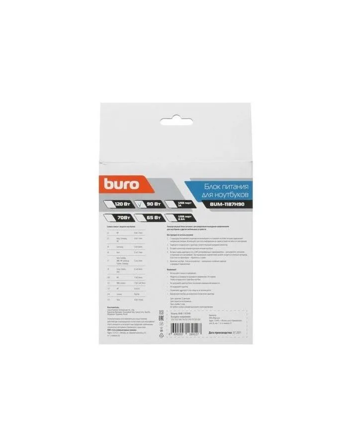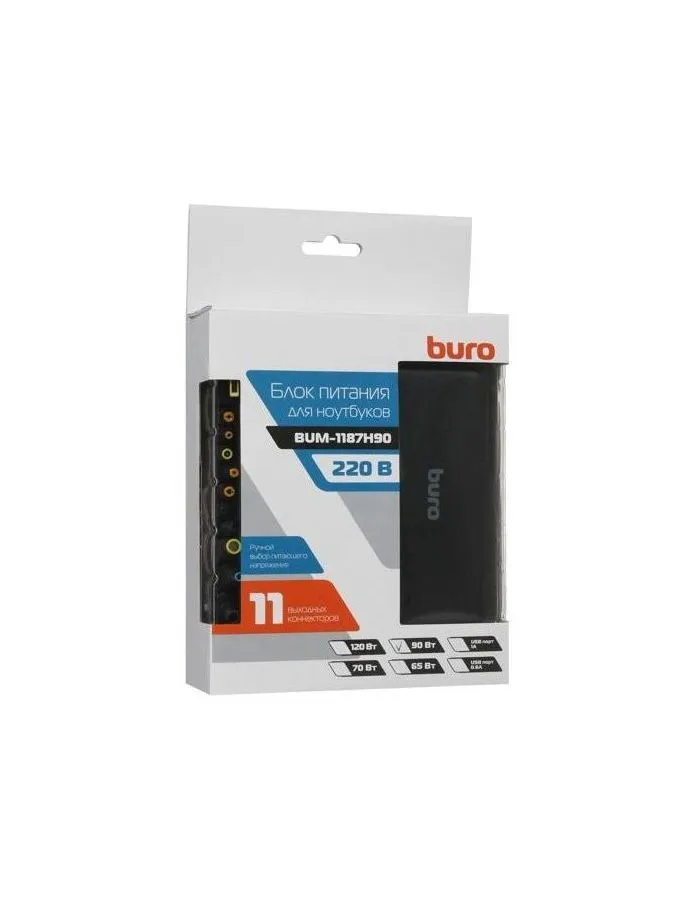 Универсальный сетевой адаптер BURO BUM-1187H90 для ноутбуков мощностью 90 ватт. В комплекте входят 11 сменных штекеров, подходящих к большинству ноутбуков. Выбор мощности для питания происходит в ручном режиме.
