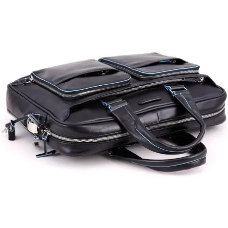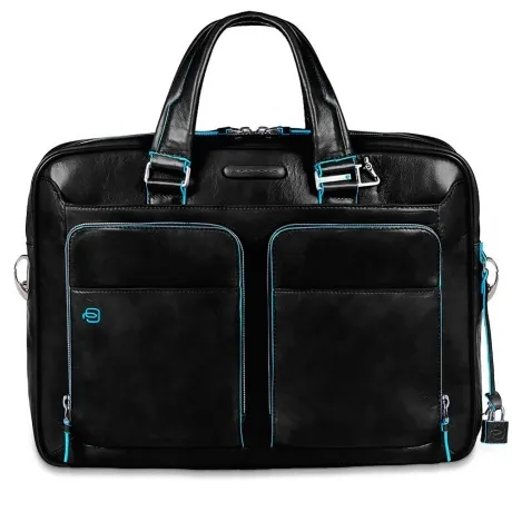 Тонкая деловая сумка для ноутбука с отделением для iPad, двумя передними карманами и двумя ручками от компании Piquadro, коллекция Blue Square. Натуральная телячья кожа черного цвета.