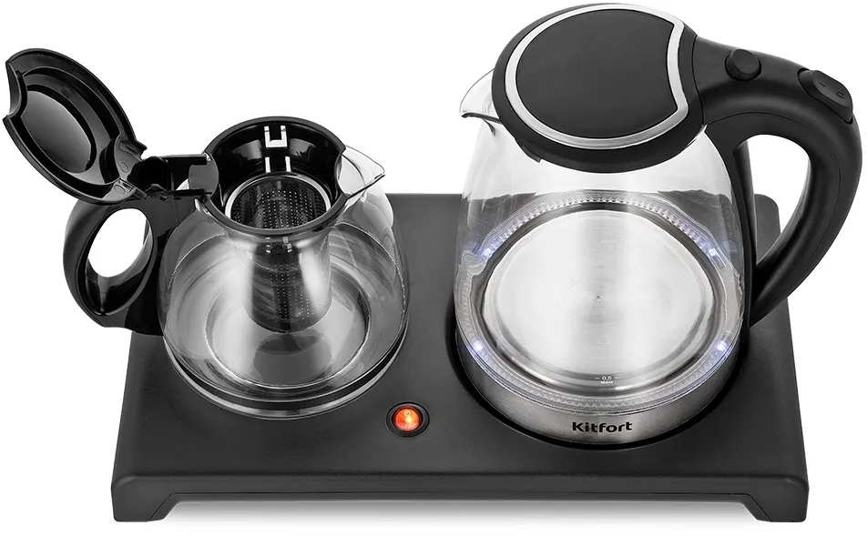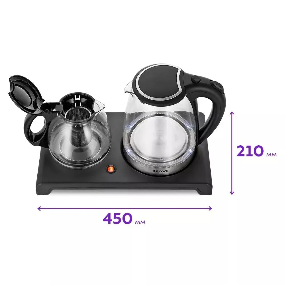 Стильный и функциональный чайный набор Kitfort КТ-6180 состоит из чайника ёмкостью 2 л, кувшина с фильтром для заварки ёмкостью 1,2 л и базы. Набор поможет вам не только вскипятить воду, но и заварить чай или кофе. Корпус чайника выполнен из стекла со вставкой из пластика. Крышка выполнена из сочетания нержавеющей стали и пластика. Мерная шкала находится на боковой стороне. Конструкция чайника не позволяет ручке нагреваться, поэтому браться за неё безопасно. Кувшин для заварки изготовлен из термостойкого стекла и имеет съёмный фильтр для чая или кофе. В месте установки кувшина на базу присутствует скрытый нагревательный элемент с функцией поддержания тепла. На базе расположена кнопка включения поддержания тепла, а сама база изготовлена из пластика. На ней компактно располагается чайник и кувшин. Небольшие габариты чайной станции позволяют расположить её практически в любое удобное место.