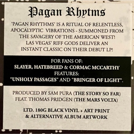 Дебютный альбом американских металистов SpiritWorld.. Американская граница: там, где горящее небо встречается с песчаными дюнами. Где затерянные дороги уходят в темноту, а нетронутые пустыни говорят на языке столь же зловещем, сколь и потустороннем. Это живая картина SPIRITWORLD. SPIRITWORLD - это также квест слухового зрения Стю Фолсома, уроженца Лас-Вегаса, который взял на себя всю интенсивность этой ужасной жары пустыни и дал ей голос, воющий сквозь похожий на Slayer гул дебютного альбома Pagan Rhythms, который теперь выходит на Century Media. Именно эта чистота видения Фолсома сразу же завоевала международное признание для SPIRITWORLD на ограниченном самостоятельном релизе Pagan Rhythms в 2020 году. Даже гитарист Exodus / Slayer Гэри Холт и бывший лидер Sepultura / нынешний лидер Soulfly Макс Кавалера восторженно отзывались об альбоме в социальных сетях. Стю и SPIRITWORLD заявили о своих правах, как головорезы и преступники, выходящие из мертвых земель, чтобы стрелять, ездить верхом и говорить свою правду. Pagan Rhythms будет доступен ограниченным тиражом на CD в диджипаке, а также в лимитированном издании на 180-граммовом виниле + Art Print в комплекте. Виниловое издание содержит альтернативную обложку, которая будет доступна только для первого тиража.