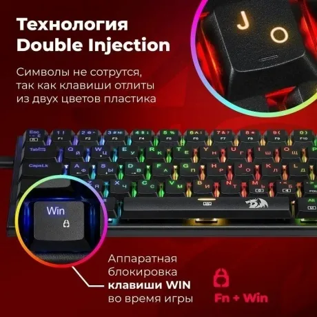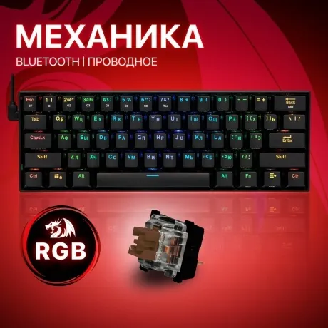 Клавиатура Redragon Draconic [77696] выполнена в прочном пластиковом корпусе черного цвета и поможет сэкономить пространство на рабочем столе. Данная модель оснащена 61 клавишами с тактильными механическими переключателями Outemu Tea, которые точно реагируют на нажатия и отличаются повышенным ресурсом службы. В клавиши интегрированы светодиоды RGB, формирующие яркие световые эффекты. Клавиатура Redragon Draconic подключается по беспроводной технологии Bluetooth или посредством USB-кабеля. Автономная работа в беспроводном режиме осуществляется на основе аккумулятора.