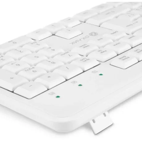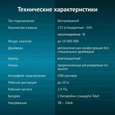 Oklick K225W – эргономичная беспроводная клавиатура с корпусом в стильном белом цвете. Она подойдет для комфортной работы в офисе и дома. Модель оборудована 113 клавишами, из них 9 – вынесены в отдельный блок и предназначены для выполнения разных мультимедийных команд. Устройство отличается долгим сроком службы: выдержит до 10 млн нажатий. Благодаря продуманной конструкции пользоваться клавиатурой приятно и удобно. Влагозащитный корпус не боится попадания брызг или капель напитков. Есть регулируемые по высоте ножки. Девайс подключается к ПК или ноутбуку по радиоканалу 2,4 ГГц, есть USB-ресивер с радиусом действия до 10 м. Питание осуществляется от двух мизинчиковых батареек AAA, которые входят в комплект. Модель совместима с ОС Windows и Linux.