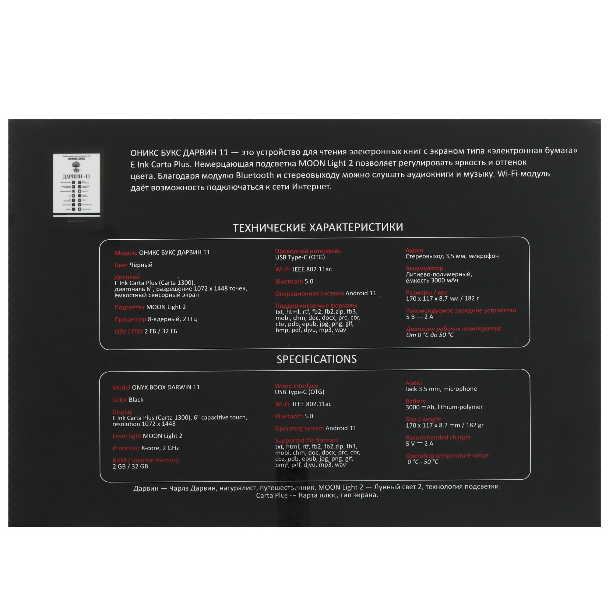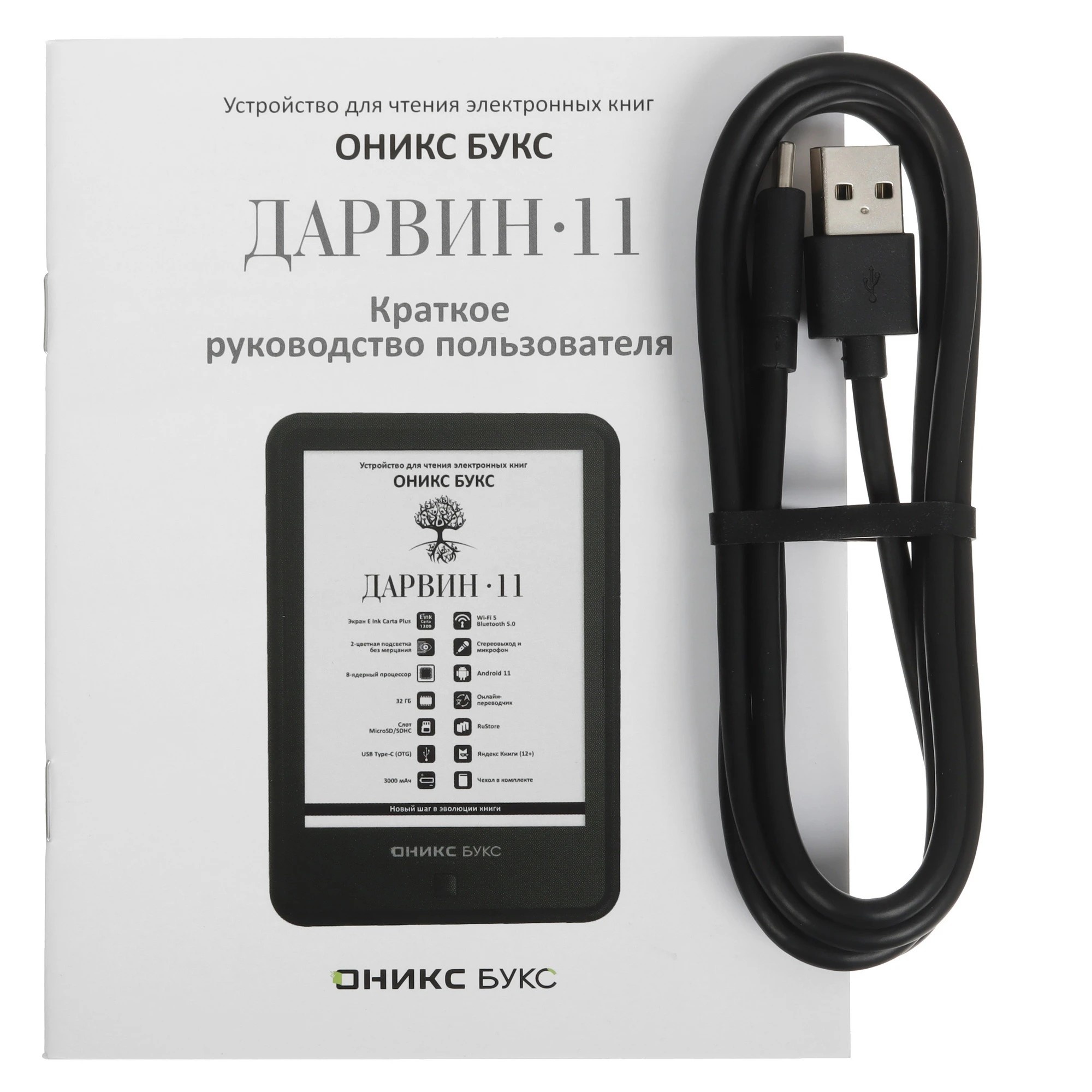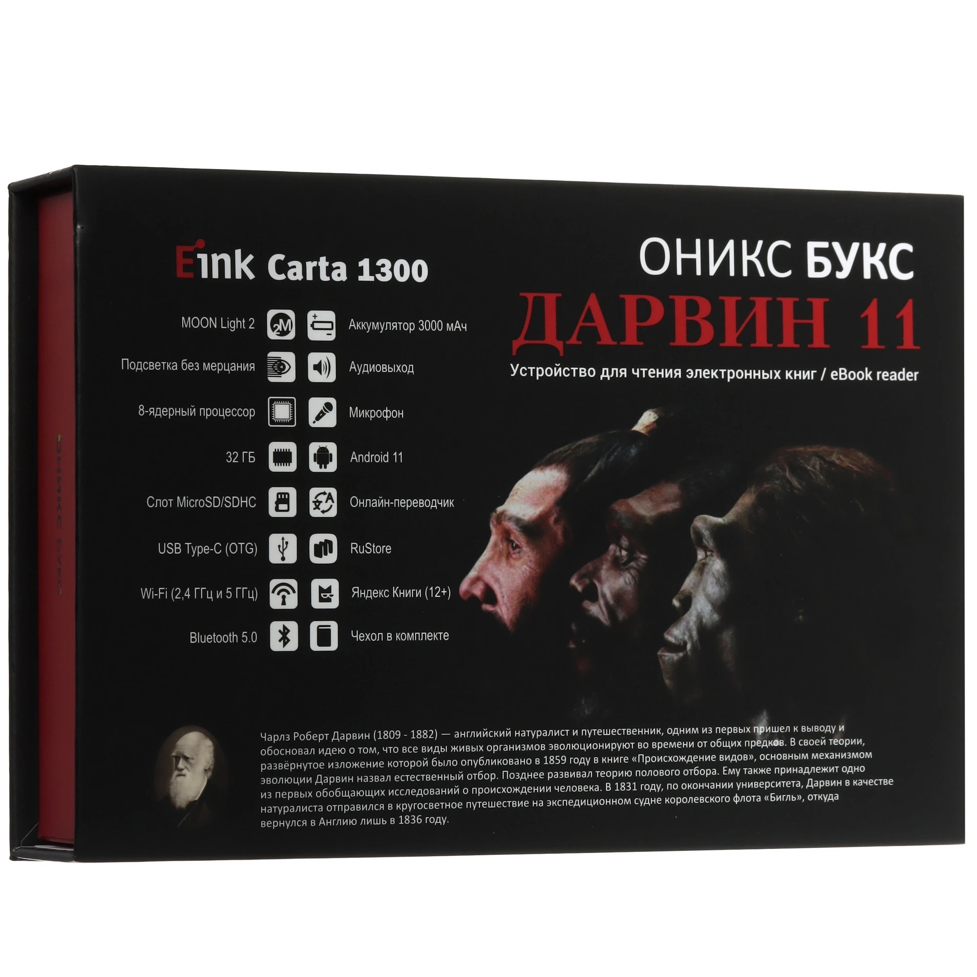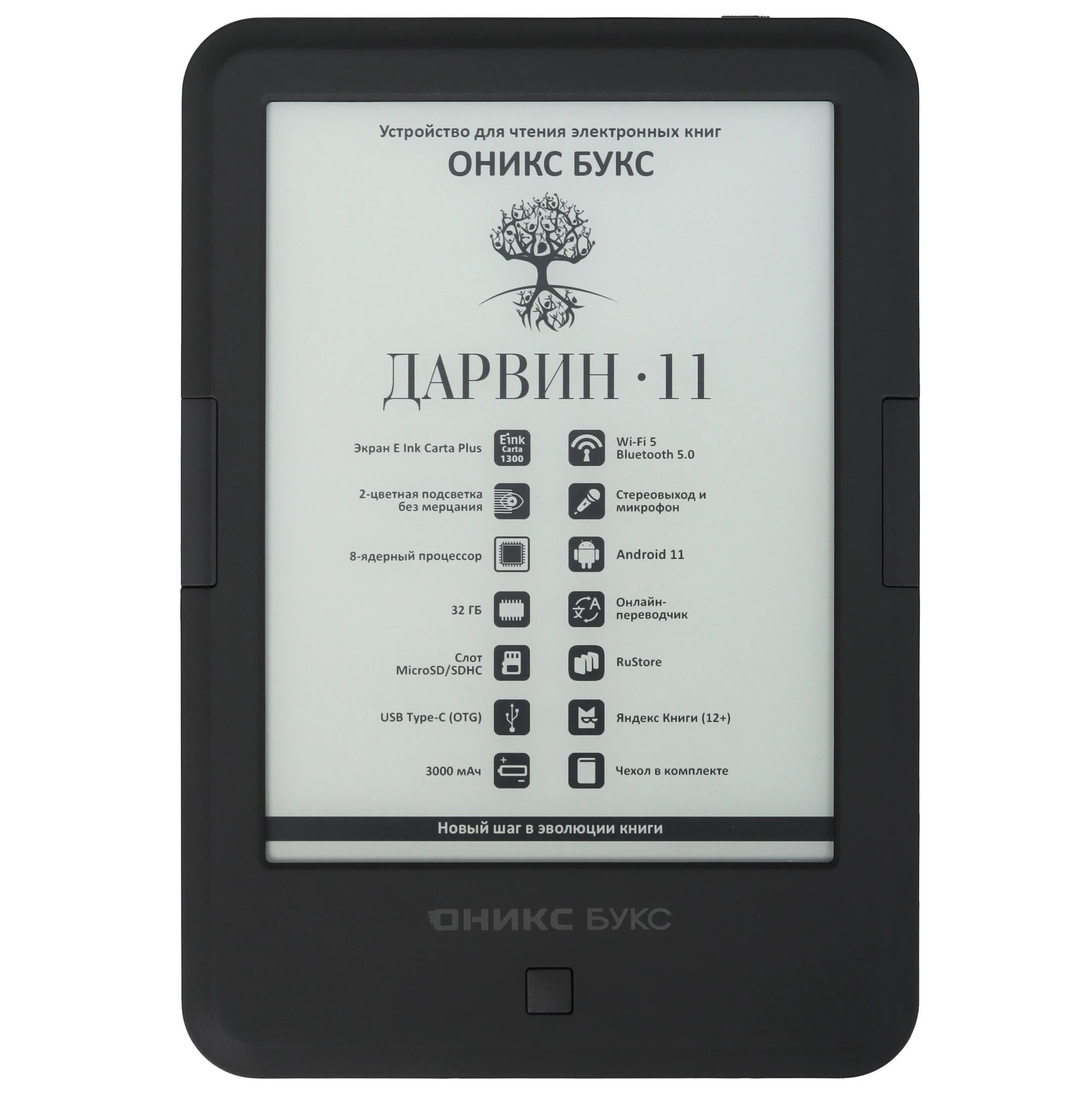 ОНИКС БУКС Дарвин 11 — компактный ридер с 6-дюймовым экраном высокого разрешения E Ink Carta Plus (Carta 1300) с подсветкой и сенсорным управлением. Модель продолжает одну из самых популярных серий производителя и выполнена в классическом корпусе с удобными кнопками управления. Устройство базируется на современном высокопроизводительном процессоре и имеет 2 Гб оперативной и 32 Гб встроенной памяти. Ридер оборудован современными модулями Wi-Fi и Bluetooth, а 32 гигабайта встроенной памяти в сочетании со слотом microSD позволяют хранить огромную библиотеку книг и документов на устройстве. Благодаря использованию операционной системы Android 11 на ридер можно устанавливать различные сторонние приложения. В составе ПО имеется магазин приложений RuStore, в каталоге которого представлено более 40 тысяч различных программ. Можно подключить к ридеру наушники или колонку и прослушивать музыку и аудиокниги, а поддержка функции Text-To-Speech позволит озвучить текстовые файлы. На ридере предустановлено множество полезных приложений, включая онлайн библиотеку Яндекс Книги (12+). В комплекте с устройством поставляется «умная» защитная обложка.