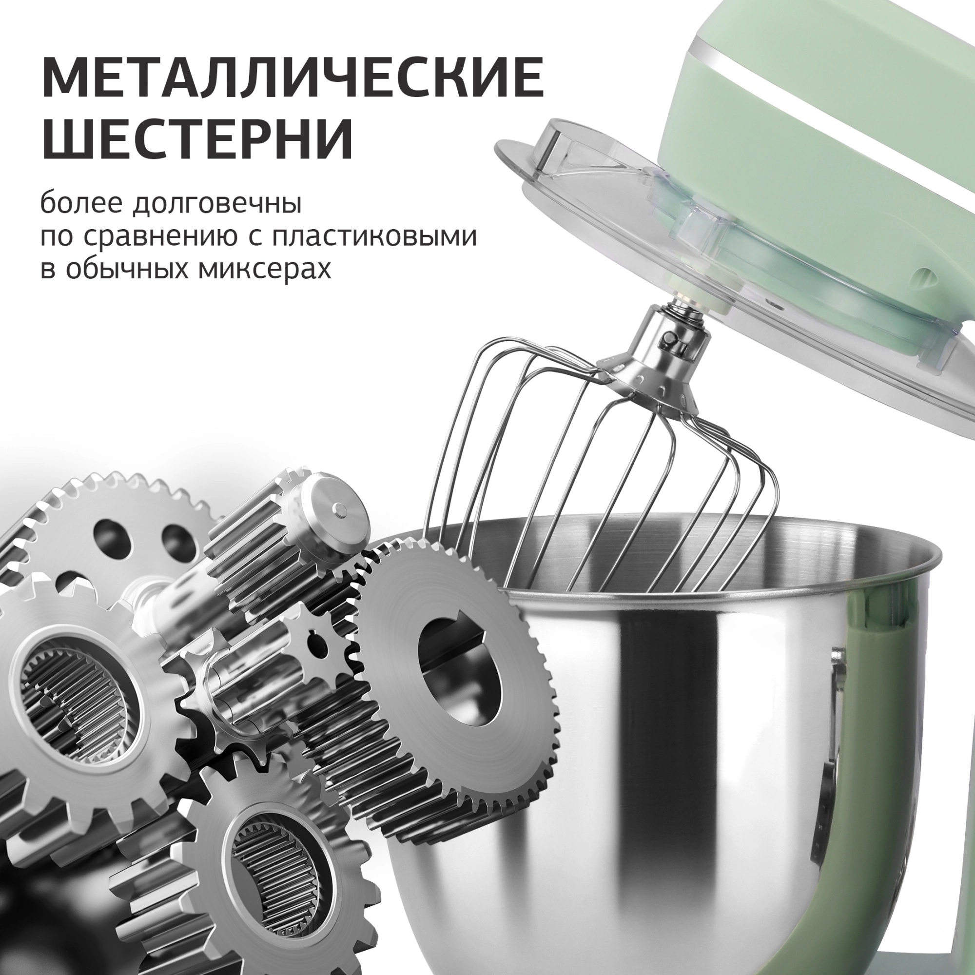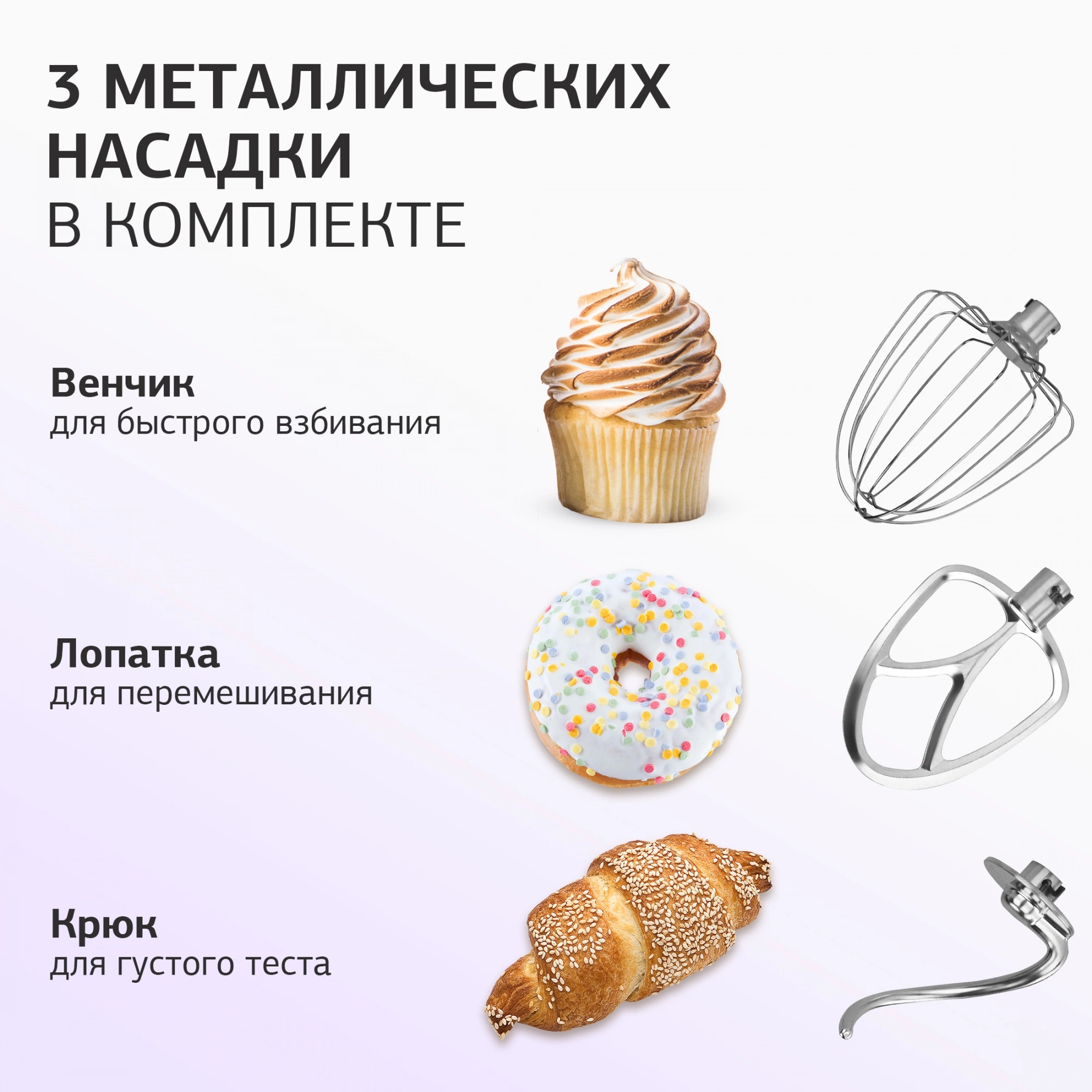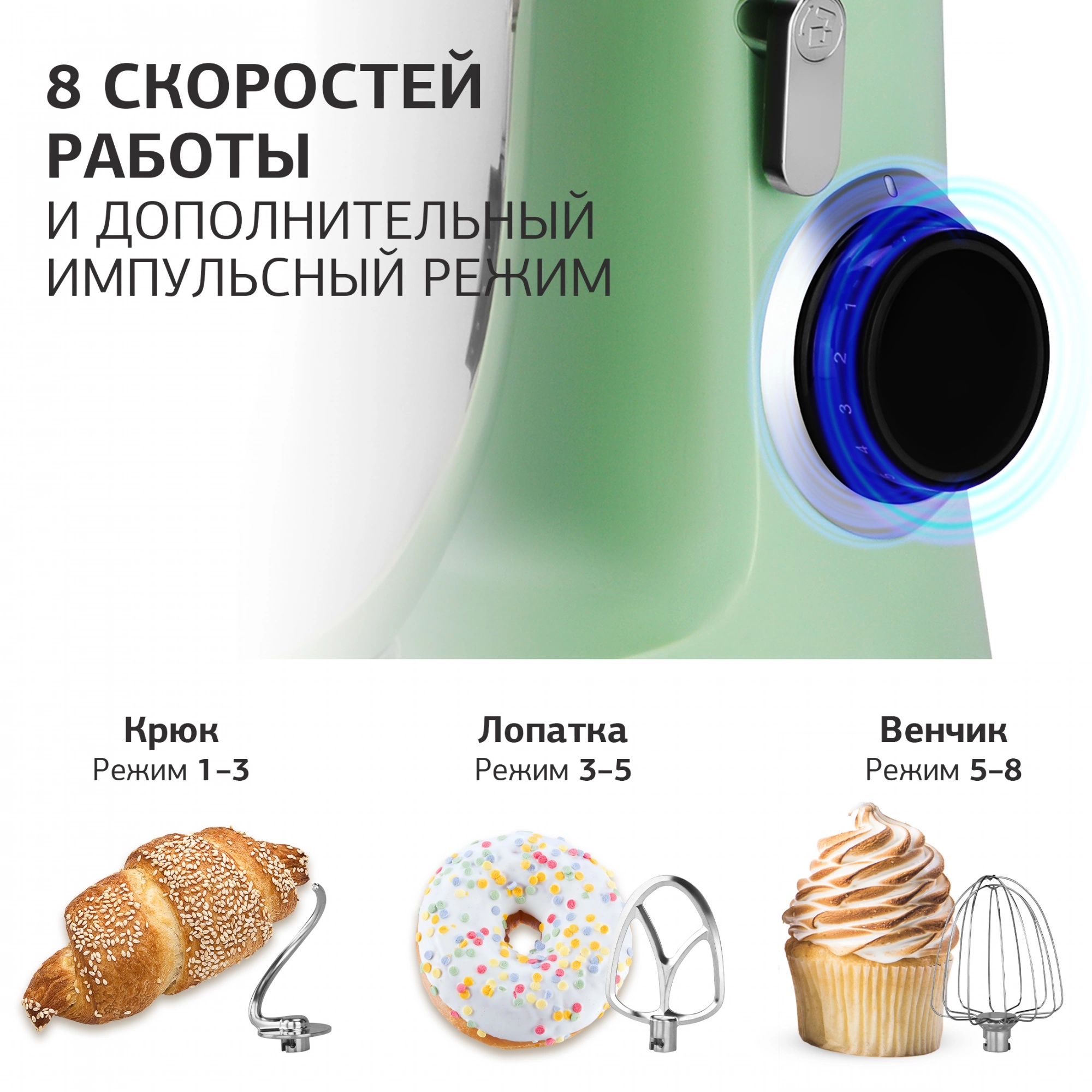 Планетарный миксер Starwind SPM6161 справится с любой, даже сложной, задачей на кухне: замесит тесто, взобьёт безе, приготовит аппетитный заварной крем. Благодаря мощности двигателя в 1300 Вт прибор идеально перемешает затянутое тесто. Объем предусмотренной в конструкции чаши – 4.5 литра, представьте, сколько всего там поместится. Принцип действия миксера основан на планетарном вращении, есть возможность выбора из 10 скоростных режимов. Корпус изготавливается на основе прочного пластика, использован мятный цвет. В комплекте есть три насадки.