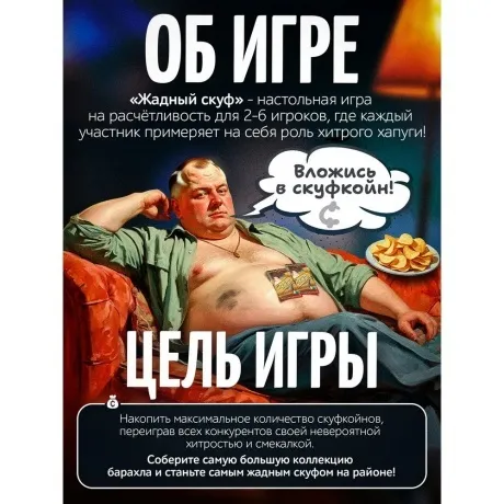 Используйте все доступные средства: пускайте пыль в глаза соперникам, заключайте сомнительные сделки и не упускайте возможности урвать свой большой куш! Много приключений ждет тебя в игре - найди свой вонючий носок, надуй резиновую Зину, прожарь шашлындос — всё пойдёт в дело ради победы! Кто здесь главный? Тот, кто соберёт самую внушительную коллекцию барахла и станет самым жадным скуфом на районе! Эта пати гейм подойдет для веселой компании, отдыха на даче или в кемпинге, в отпуске, улыбки и смех Вам обеспечены!!! Пока идет дождь – соберите свою большую коллекцию и станьте самым жадным Скуфом!