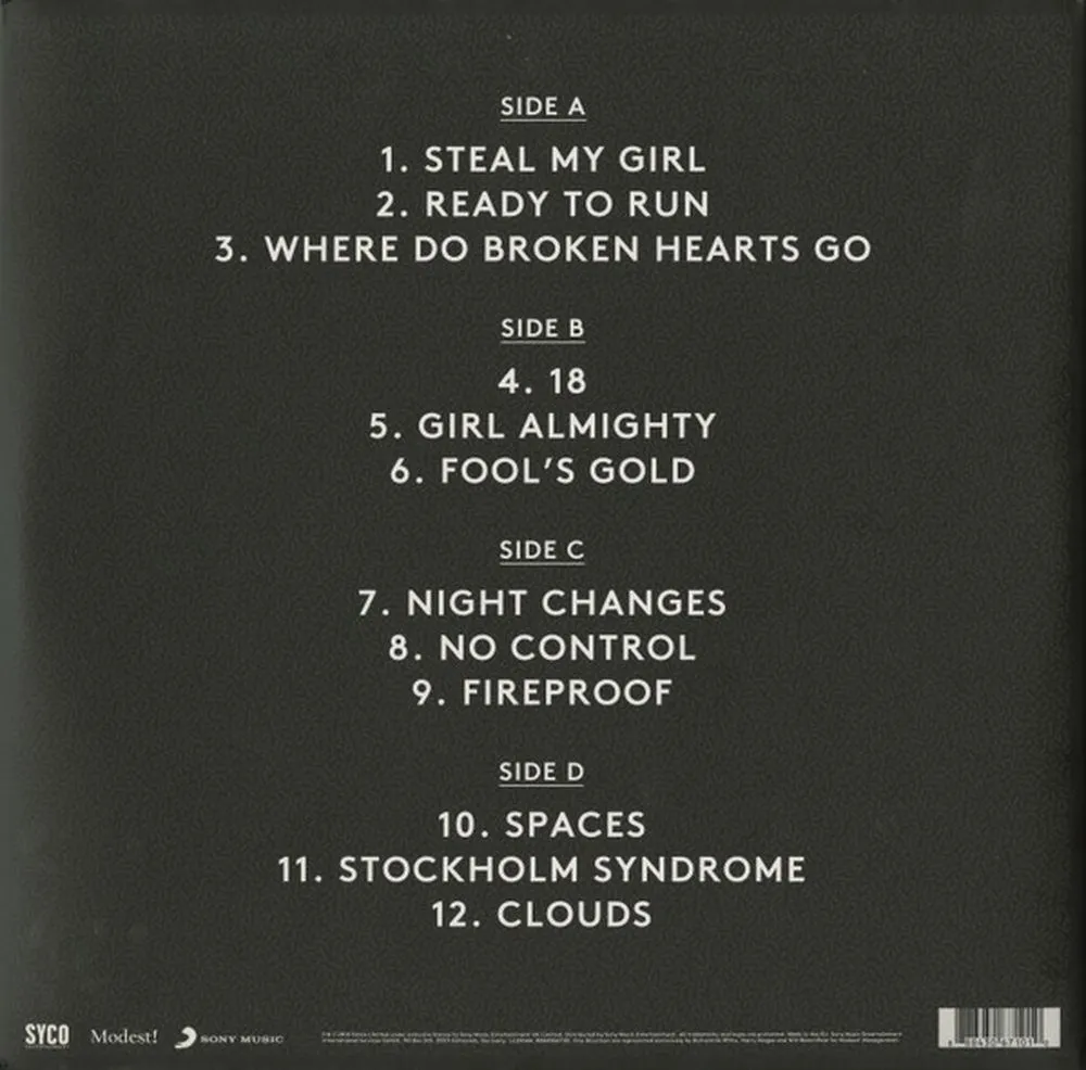 Steal My Girl, Ready To Run, Where Do Broken Hearts Go, 18, Girl Almighty, Fool's Gold, Night Changes, No Control, Fireproof, Spaces, Stockholm Syndrome, Clouds