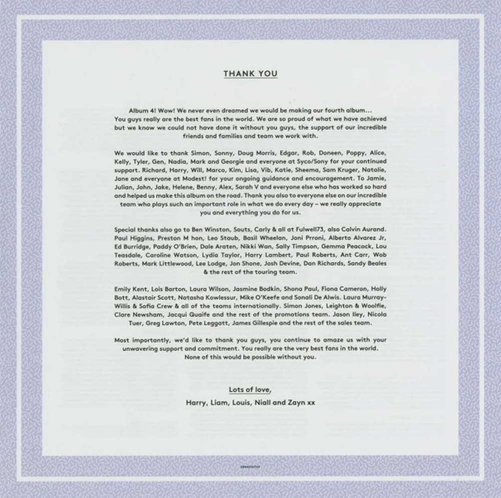 Four — четвертый студийный альбом англо-ирландский Бойз-бэнд One Direction. Студийный альбом FOUR, пожалуй, самой успешной группы планеты на данный момент, One Direction. Парни не скрывают, что хотели бы повторить успех предыдущего релиза Midnight Memories, ставшего самым продаваемым альбомом 2013 года. Мировая премьера новой работы коллектива состоится 17 ноября. Название альбома означает одновременно и четвертый по счету альбом и четыре года существования группы, за которые ребята сумели вырасти в звезд поистине мирового масштаба. Третий альбом Midnight Memories сделал их первой группой в истории шоу-бизнеса, каждый из трех релизов которой дебютировал на первой строчке американского Billboard, альбом стал №1 в 20 странах по всему миру!. У новой масштабной работы шансы на грандиозный успех тоже более чем убедительные, ведь, во-первых, это будет самый откровенный альбом из всей дискографии коллектива, а во-вторых, он выходит вслед за грандиозным гастрольным туром «Where We Are» и всемирным показом фильма-концерта «This Is Us». 3 миллиарда просмотров в YouTube, 20 миллионов фолловеров в Twitter и 34 миллиона в Facebook, 46 миллионов проданных альбомов.